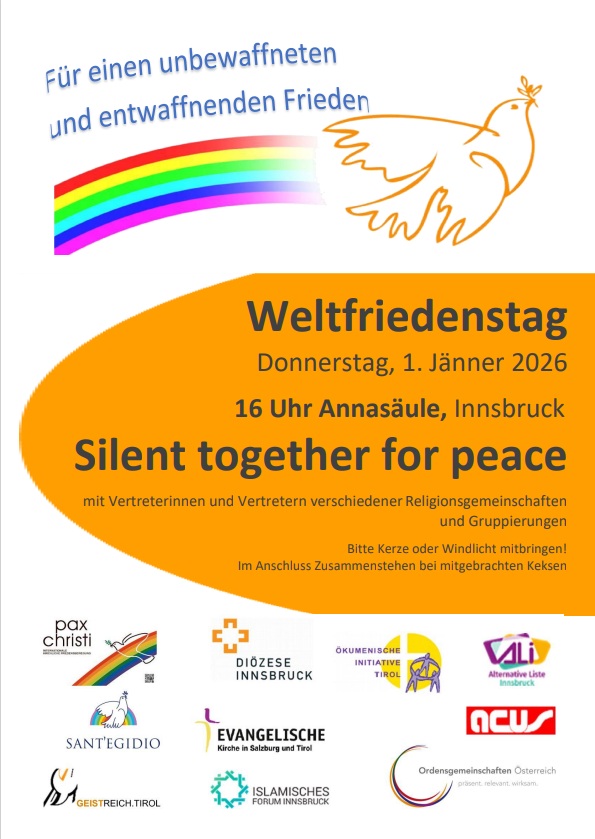16:00: Innsbruck, Interreligiöse Kundgebung zum Weltfriedenstag16:00: Innsbruck, Interreligiöse Kundgebung zum Weltfriedenstag Annasäule Innsbruck, |